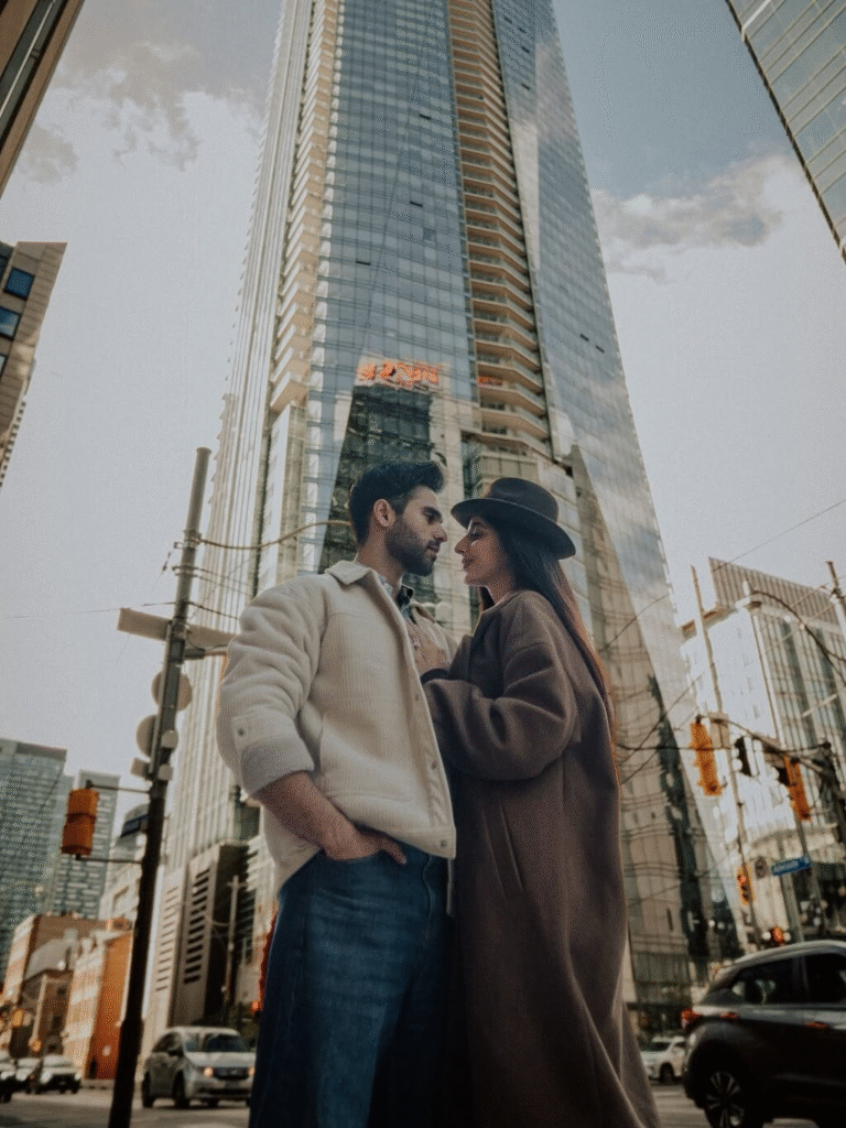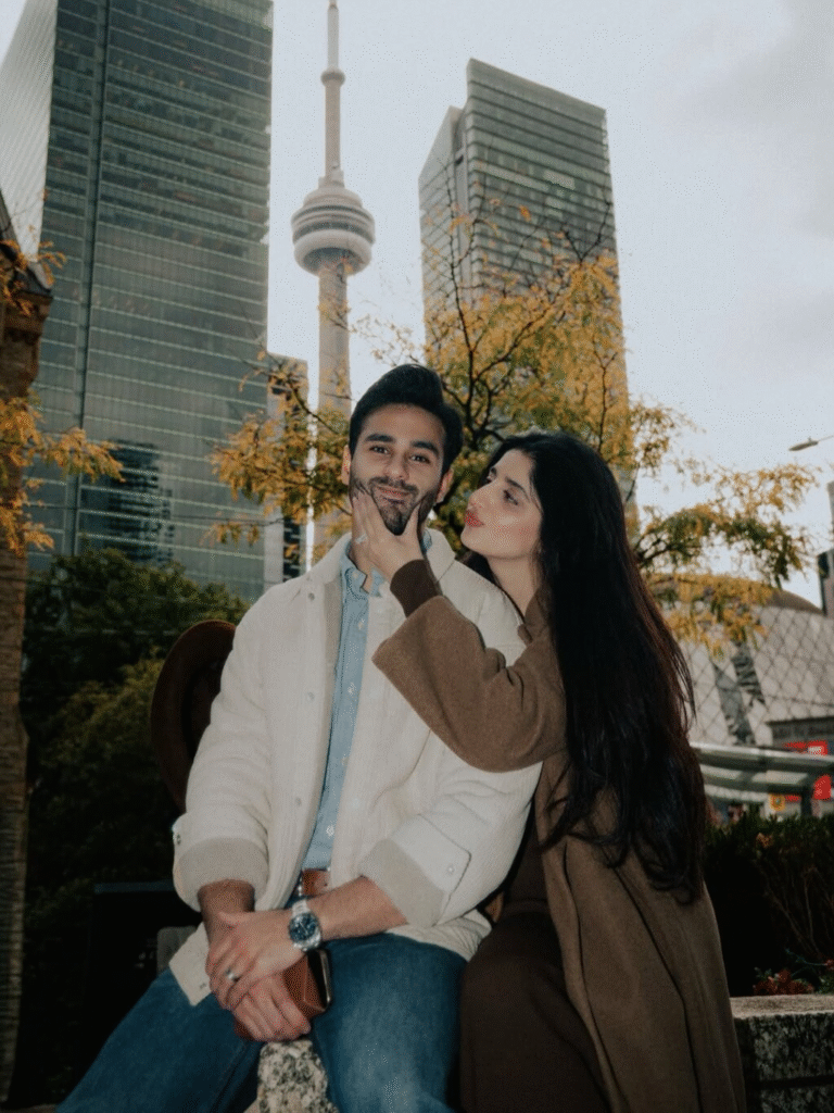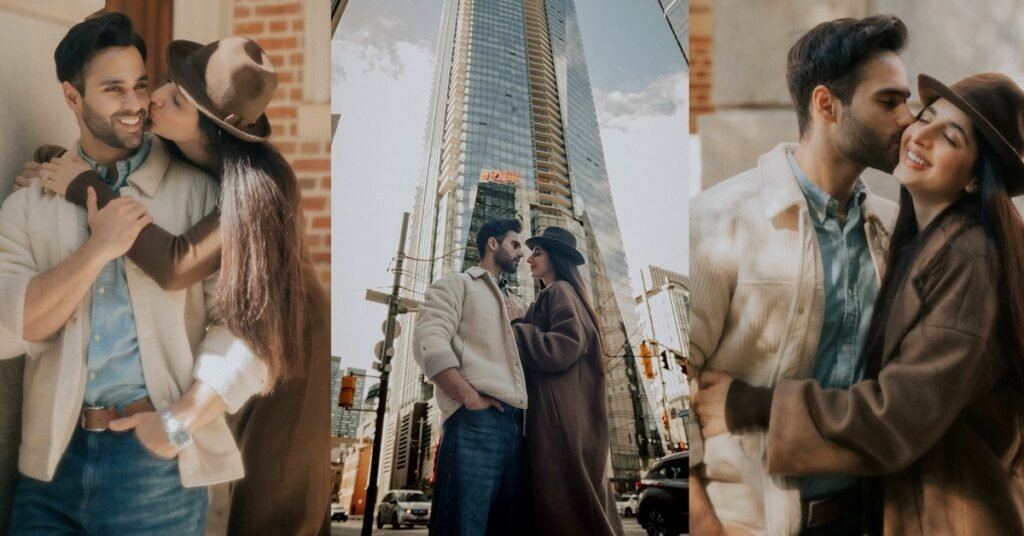 During their romantic getaway, Mawra shared heartwarming photos from their Canadian honeymoon, captioning them, “Canadian honeymoon with my Canadian boy.” She looked effortlessly chic in a long brown coat paired with a matching outfit, while Ameer complemented her look in a beige jacket, blue shirt, and classic denim pants.