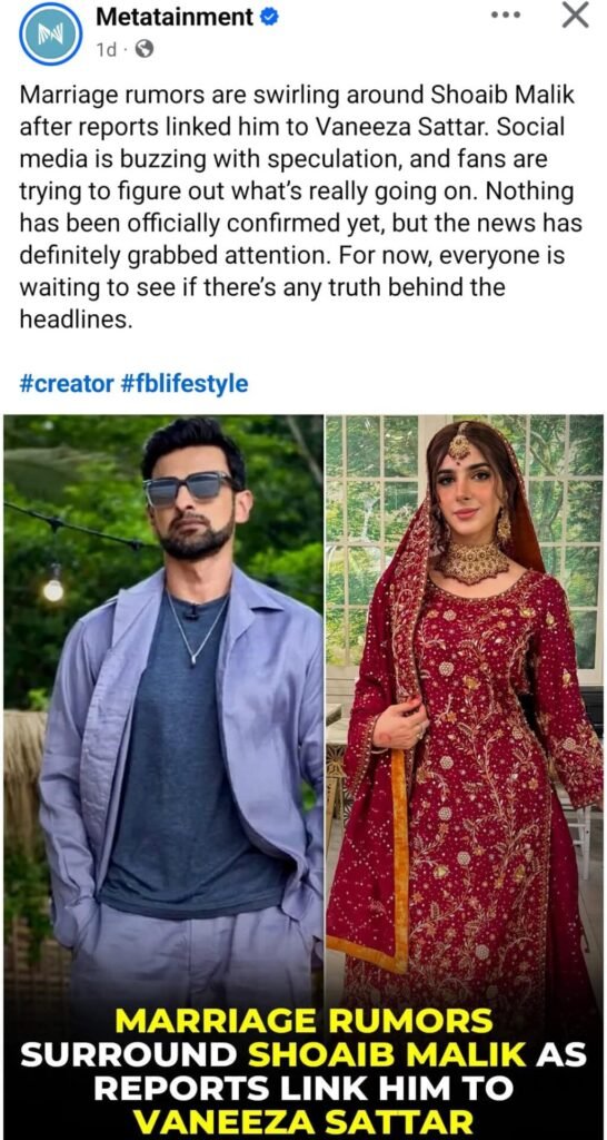 The speculation claimed that Shoaib Malik had secretly married Vaneeza Sattar, best known for her role in the drama serial Laadli. As the gossip spread online, many questioned the timeline of Malik’s previous relationships, especially his divorce from Sania Mirza and his second marriage to Sana Javed.